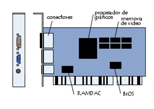 Se encuentra integrada en la tarjeta madre pero puede remplazarse o trabajar junto con otra tarjeta de expancion conectada a una de las ranuras. Se compone , basicamente , de dispositivos fisicos de salida, memoria de video, procesador grafico y conversor de senal digital-analoga.